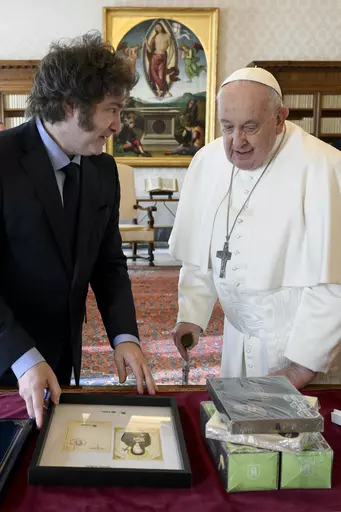 Milei, who once called the pope an “imbecile,” gave Francis some of his favorite Argentine dulce de leche alfajor cookies and lemon biscuits. Francis presented him with the documents of his papacy and a medallion.