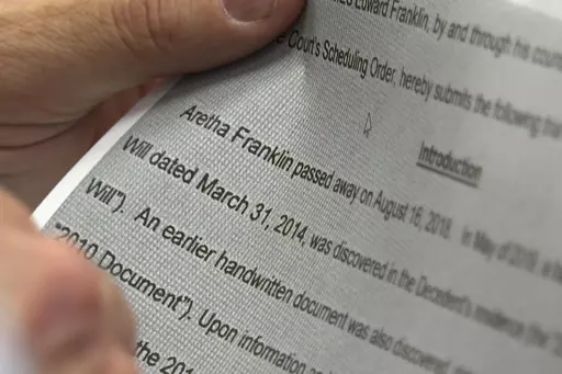 The dispute is pitting a son against other sons. Ted White II believes papers dated in 2010 should mainly control the estate, while Kecalf Franklin and Edward Franklin favor a 2014 document. Both were discovered in Franklin's suburban Detroit home, months after her death from pancreatic cancer in 2018 at age 76.