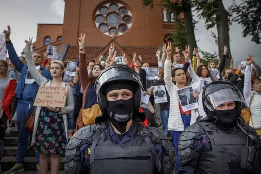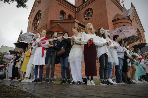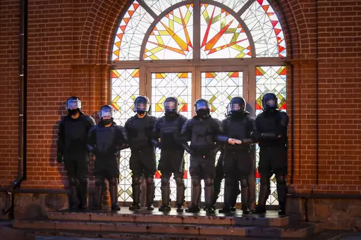 In a famous incident amid the protests on Aug. 26, 2020, about 100 people took refuge from police in the landmark Sts. Simon and Helena Catholic Church, a red-brick structure just off the main government square in Minsk. Weeks later, the church again became the focus when dozens of women dressed in white joined its senior priest, the Rev. Uladislau Zavalnyuk, in forming a human chain around it.
