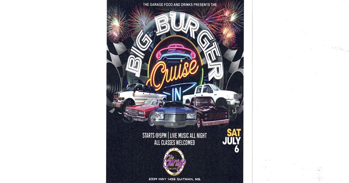 While the Muscadine Festival won’t take place in July, he does plan to hold the Big Burger Cruise In at The Garage, located at 2339 Highway 145 South in Quitman, on Saturday, July 6, from 5:00 p.m. – 10:00 p.m. for everyone to come and enjoy.