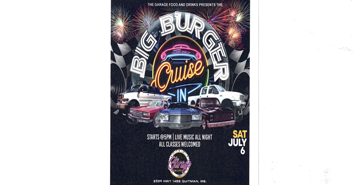 While the Muscadine Festival won’t take place in July, he does plan to hold the Big Burger Cruise In at The Garage, located at 2339 Highway 145 South in Quitman, on Saturday, July 6, from 5:00 p.m. – 10:00 p.m. for everyone to come and enjoy.