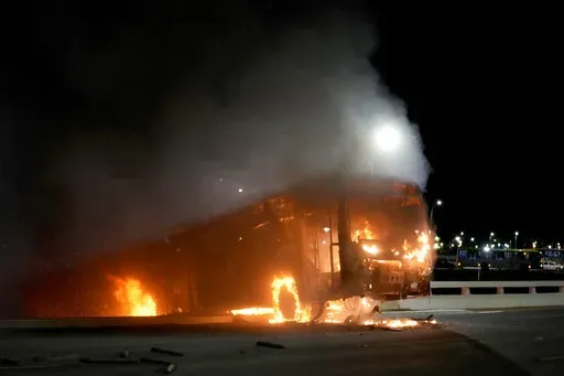 Protesters elsewhere set at least one bus on fire and were seen gathering metal barriers.