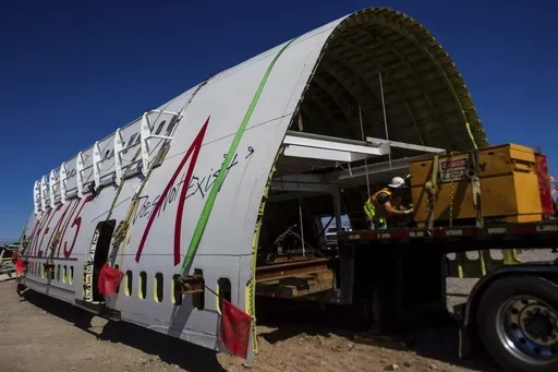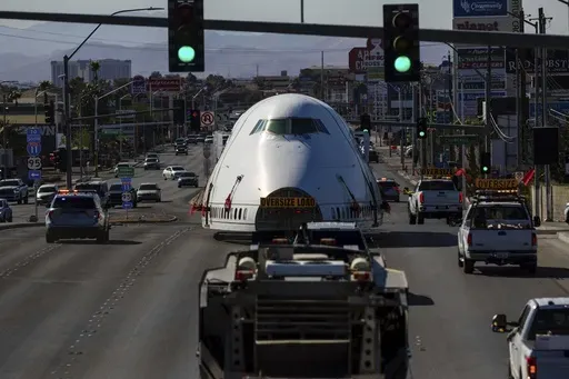 The cockpit and section of the fuselage of the Boeing 747 were towed Wednesday from a spot at the Las Vegas Motor Speedway on the northern part of the city to a nearby entertainment district known as AREA15. The district bills itself as a site for immersive art installations, including Meow Wolf.