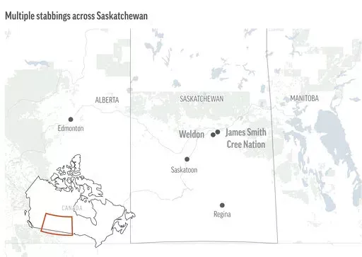 Police in Saskatchewan got their first call about a stabbing at 5:40 a.m. on Sunday, and within minutes heard about several more. In all, dead or wounded people were found at 13 different locations on the sparsely populated reserve and in the town, Blackmore said. James Smith Cree Nation is about 30 kilometers (20 miles) from Weldon.