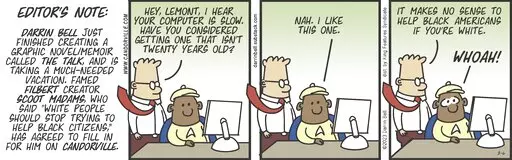 In the strips running Monday to Saturday, Bell paired Dilbert with one of his own characters, Lemont Brown. In one, Dilbert hopes Lemont will side with him in his quest to get a laundry room installed at work.