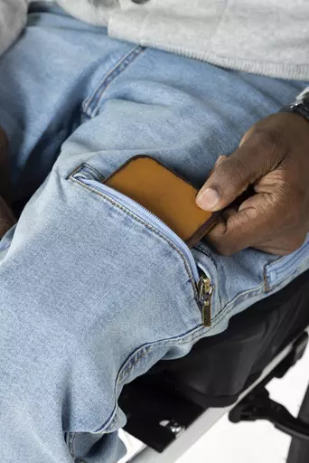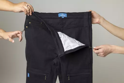 She turned her solution into No Limbits. It offers hipster jeans and other pants with side zippers, less bulk at the front and stretchy waist bands for wheelchair and prosthetics users. She included front thigh pockets for easy access while seated.