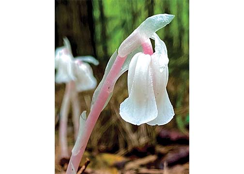 But they are not mushrooms, they are actually flowers of a rare leafless relative of blueberries, huckleberries, and heathers whose flowers, pollinated by bees and flies, are nodding bells on short stalks, all ghostly waxy white, sometimes with flecks of pink, and translucent petals you can see through.
