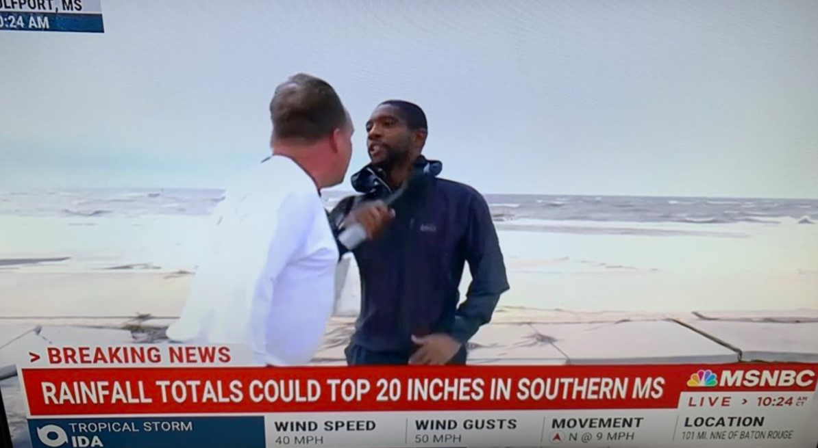 NBC correspondent Shaquille Brewster was doing a live shot for MSNBC from a Gulfport beach on Monday morning when a pickup truck drove up behind him. A man jumped out and ran toward him.