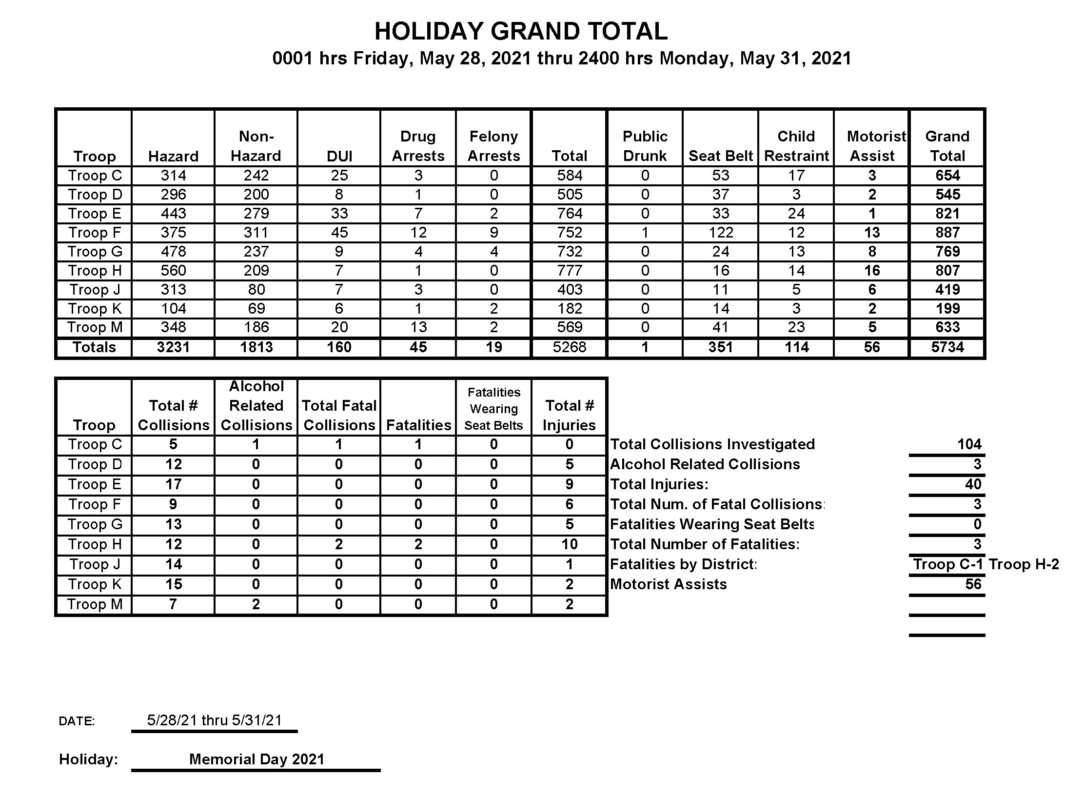 The Mississippi Highway Patrol concluded its 2021 Memorial Day Travel Enforcement Period which began Friday, May 28th, at 12:01a.m. and ended Monday, May 31st at midnight. Throughout the period, MHP issued 5734 citations with 160 DUI arrests. A total of 104 crashes were investigated including 3 fatalities and 40 injuries on state, federal highways, and interstate systems. State Troopers conducted saturation patrols and safety checkpoints throughout the enforcement period.
