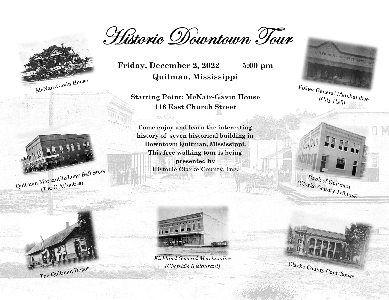 • Historic Clarke County, Inc. Downtown Historical Tour - Friday, December 2, at 5 p.m. McNair-Gavin House, 116 East Church Street. Learn the historical significance with interesting facts and stories of seven buildings in the Quitman Downtown Mill District. This event is free to the public.