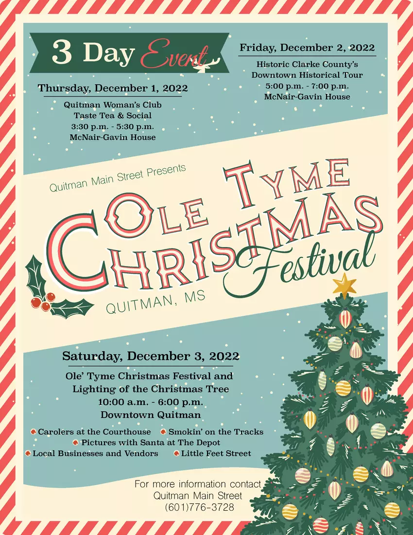 • The City of Quitman Main Street is proud to announce the upcoming Ole' Tyme Christmas Festival and Tree Lighting Event on Saturday, December 3, in the Quitman Downtown Historical District from 10:00 a.m. to 6:00 p.m. The official lighting of the Christmas Tree will be at 6:00 p.m. mainstreet@ci.quitman.ms.us.