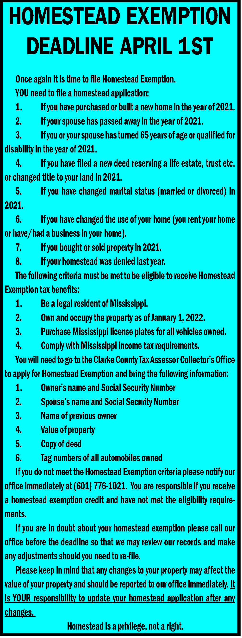Once a person has filed for homestead, that person doesn’t have to file again unless there is a major change in the family or property. It is extremely important to make sure that all information provided on the application is current, or it could cost later on.