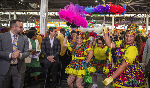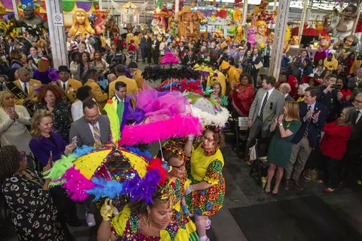 City officials marked the pre-Lenten season's start by dancing their way into an event amid brass band music, costumed revelers and giant figurines of jesters and fantasy characters at Mardi Gras World by the Mississippi River. The cavernous venue is where many parade floats are assembled and stored.