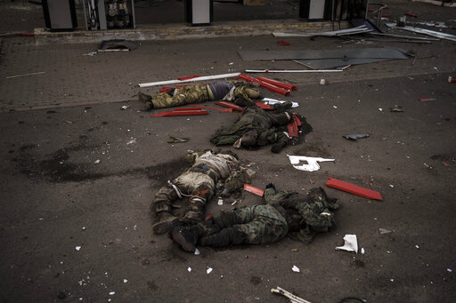 Associated Press journalists saw the bodies formed into a Z, wearing the white arm bands commonly used by Russian soldiers, and with some Russian medical kits alongside them. They were found on a front line where fighting had been taking place for days. They, along with the burned man, were taken to a morgue on Monday. There was no explanation for the Z formation — a symbol of the Russian invasion — nor the burned body propped on the barrier. Either could be considered a war crime, for disrespecting the dignity of the dead.