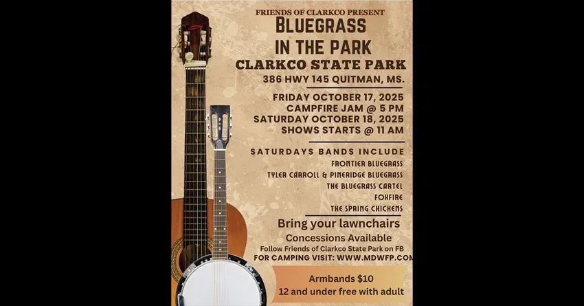 Friends of Clarkco are excited to host their Annual Bluegrass in the Park at Clarkco State Park on Saturday, October 18, starting at 11:00 a.m.