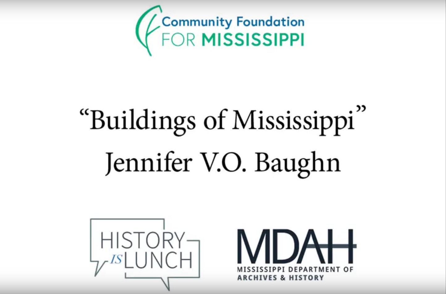 On May 5, 2021, Jennifer V.O. Baughn presented “Buildings of Mississippi" as part of the History Is Lunch series.