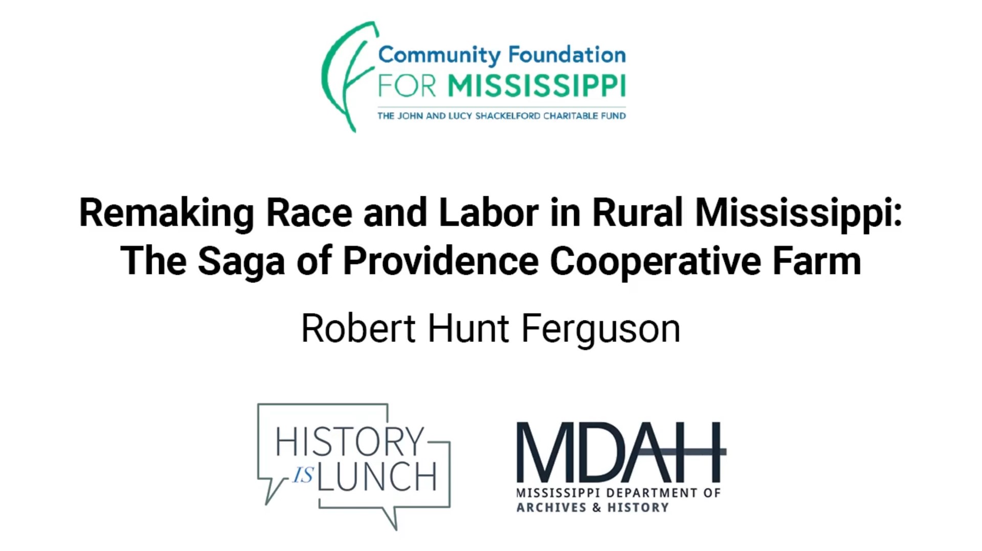 On June 23, 2021, Robert Hunt Ferguson presented “Remaking Race and Labor in Rural Mississippi: The Saga of Providence Cooperative Farm” as part of the History Is Lunch series.