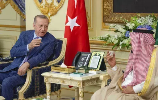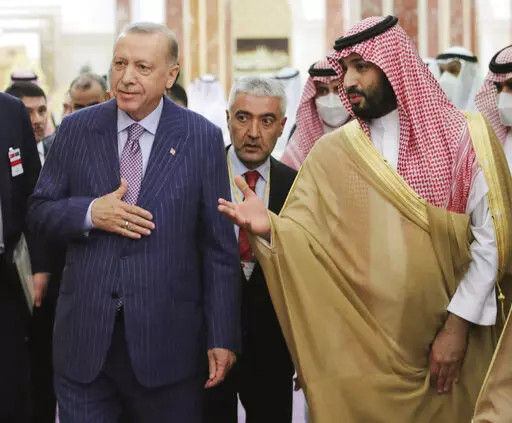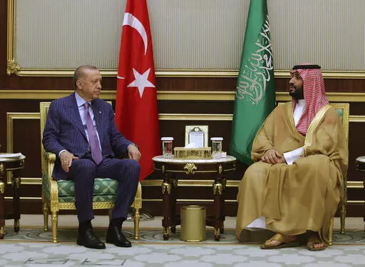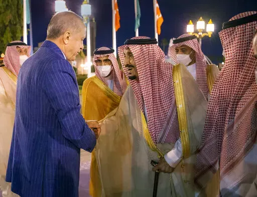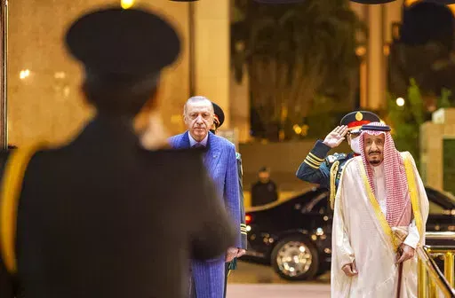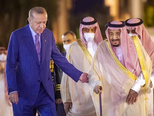 In his first trip to Saudi Arabia in five years, Turkish President Recep Tayyip Erdogan embraced Crown Prince Mohammed bin Salman and sipped traditional Arabic coffee with King Salman before a state dinner and direct talks that ran into the early hours of Friday.