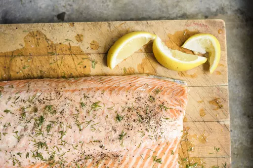 A whole side of salmon also is an excellent choice — and relatively hands off. A quick marinade in soy sauce infuses the fish with earthy dimension, but be sure to not marinate for more than 20 minutes or its saltiness will become overpowering.