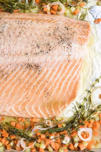 The salmon is drizzled with dry vermouth, then roasts in a foil-wrapped baking dish with shallot, carrot, celery and thyme. The vermouth’s herbal elements add dimension to the dish. Once the fish is cooked, the drippings are transformed into a delicious sauce enriched with butter and fresh dill. A squeeze of lemon enlivens the flavors.