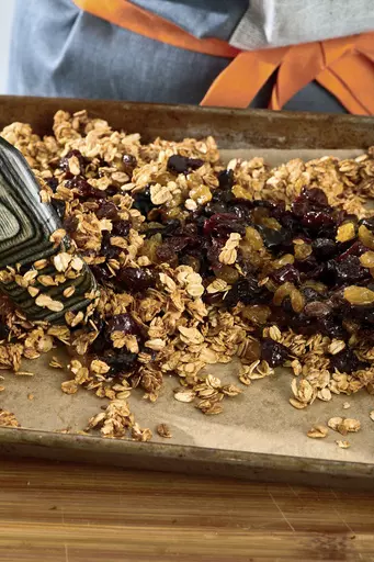 Because the dried fruit will burn if baked too long, add it to the oat mix only during the second part of bake time. Baking it lets it becomes chewy and incorporated into the mix.
