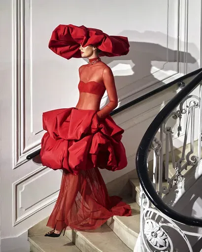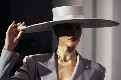 Ultra-wide brim hats stole the show in black, royal blue and bright red. There was plenty of sparkle, and an asymmetrical set of huge tiered ruffle bell sleeves on one high-neck evening dress in white. One sleeve started at the shoulder and the other at the elbow.