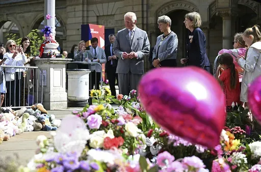 LONDON (AP) — King Charles III met Tuesday with survivors of the stabbing rampage that killed three young girls in northern England, viewing flowers and teddy bears laid in remembrance of the victims and signing a book of condolence as Britain recovers from widespread unrest fueled by misinformation around the tragedy.