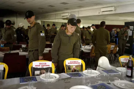 On Thursday, photos of those abducted lined the empty chairs around the traditional Seder table, with flyers citing the names of those who had been killed or taken beside commemorative candles.