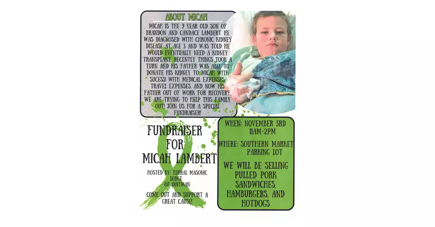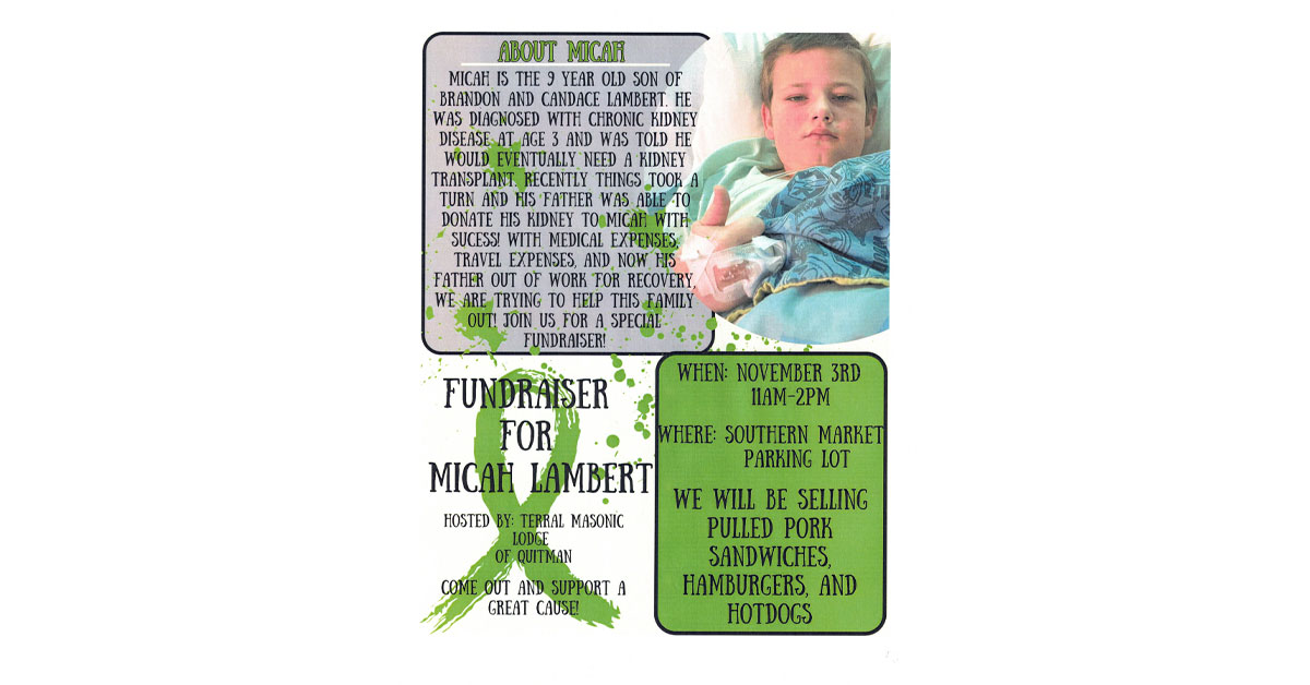 The Terral Masonic Lodge of Quitman will be hosting a fundraiser event for Micah Lambert on November 3 from 11:00 a.m. – 2:00 p.m. in the Southern Market parking lot. They will be selling pulled pork sandwiches, hamburgers, and hotdogs.