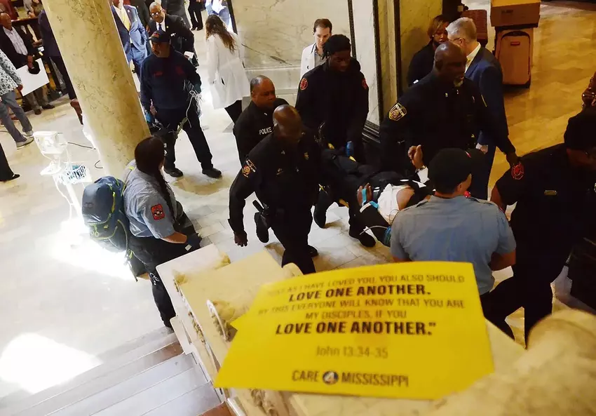 “Providing affordable health care for hard-working and vulnerable Mississippians is a matter of life and death,” Jason Coker, the president of the nonprofit Together for Hope, said shortly before Magee collapsed. “All the clergy here today are asking our government, the government of Mississippi, to choose life.”