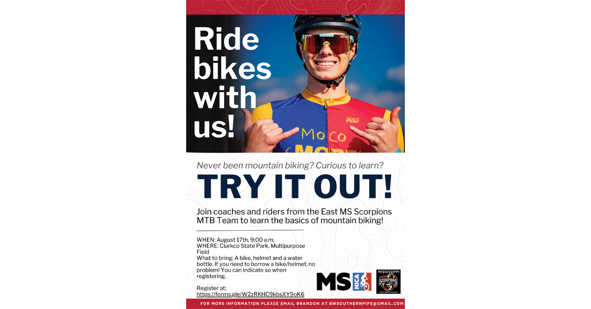 Mississippi NICA and Mississippi State Parks are sponsoring a “Try-It-Out” mountain bike event on Saturday, August 17, at 9:00 a.m. from the multipurpose field at Clarkco State Park, located at 386 Clark County Road in Quitman.