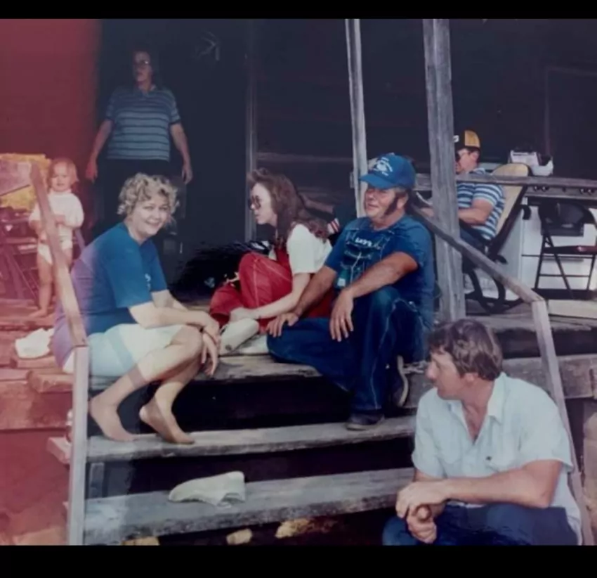 Pictured below on the steps of the " Front Porch" are my brother Mike on the bottom step, my brother Larry and his wife Carol, in the middle of Larry and Carol is yours truly ( Johnna ) with my long hair, red britches and coke bottle glasses. Behind Carol, Mike's daughter Denise peeps out, behind Larry my Uncle J.L. Guin can be seen. Standing solidly right where she longed to be up until her dying day, my sweet Momma Ruby Moore watches over us all...퇽ퟘ