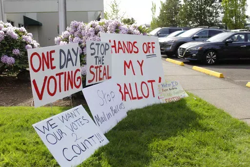 “This affects all of us. This is voter integrity,” said Janet Bailey, a Republican voter who protested outside the Clackamas County election offices Thursday with about a dozen others. “We, in Oregon, a week ago we had our primary, and we still don’t know the results.”