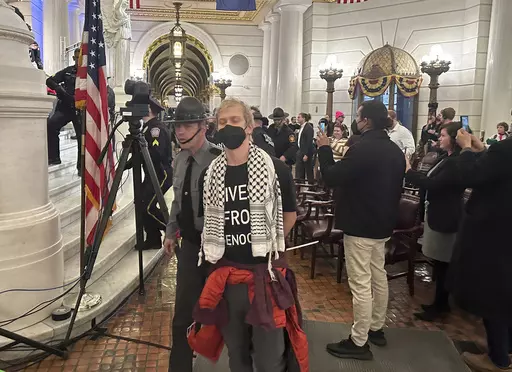 HARRISBURG, Pa. (AP) — Police took into custody more than 100 people protesting the Pennsylvania state government's investments in Israel on Monday, shutting down a demonstration on the steps of the Capitol Rotunda in Harrisburg.