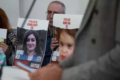 Francis met at the Vatican with 12 relatives of some of the 240 hostages held by Hamas in Gaza for about 20 minutes. Separately, he met for about the same amount of time with 10 Palestinians whose relatives have been killed or otherwise affected by the war in Gaza, along with priests who minister there.