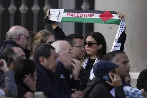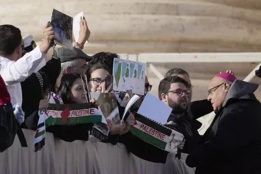Francis spoke about the meetings at the end of his weekly general audience in St. Peter's Square, where some people in the VIP seats wearing Palestinian scarves held up small posters showing bodies in a ditch and the word “Genocide” written underneath.