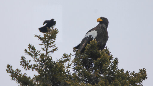 Maine's lone Steller’s sea eagle is an adult, and its sex is not confirmed. It is sometimes seen around bald eagles, dwarfing the national symbol. The Steller's, named for German naturalist Georg Wilhelm Steller, is one of the largest eagles in the world, often weighing 13 to 20 pounds (6 to 9 kilograms) — twice as much as a bald eagle.