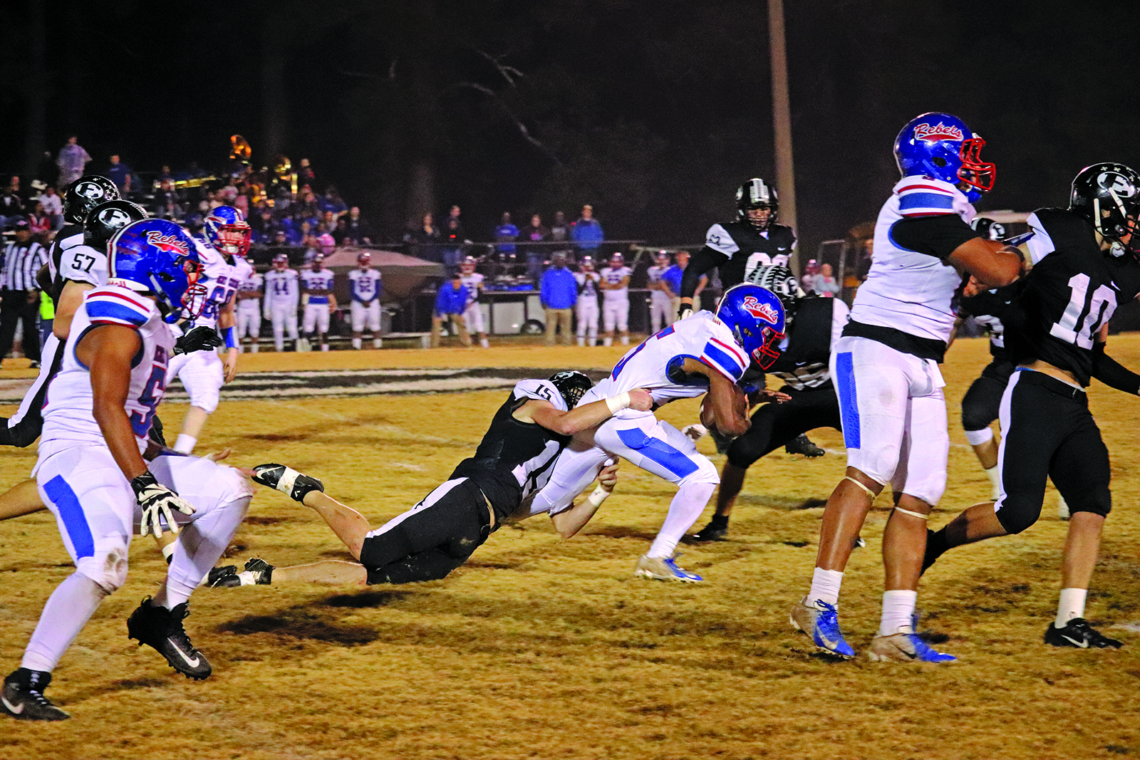 Enterprise would cough up the football on their ensuing possession, giving Scott Central the ball back deep in Bulldog territory. A 13-yard touchdown run by the Rebels would extend the lead to 41-0.