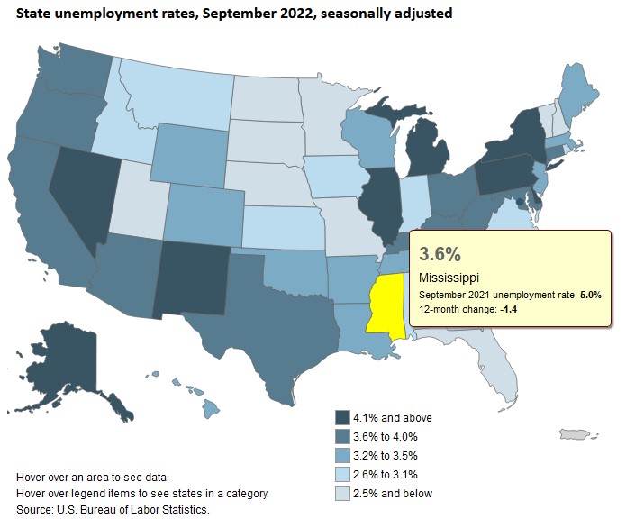 The current unemployment rate for Mississippi (as of September 2022) stands at 3.6 percent.