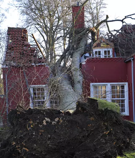 Southern parts of Sweden were badly hit, too, and thousands of households were without electricity by Sunday afternoon. Ferries to the Baltic Sea island of Gotland were canceled because of strong winds.