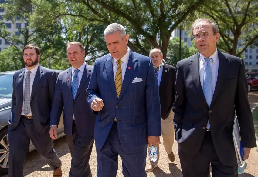 Mississippi House speaker Philip Gunn, center, and Lt. Gov. Delbert Hosemann, right, talk after Gov. Tate Reeves press conference at the State of Mississippi Woolfolk Building in Jackson, Miss., Thursday, May 7, 2020. Credit: Eric J. Shelton/Mississippi Today