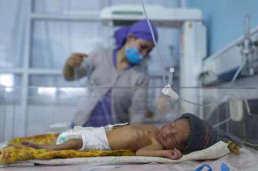 Qandi Gul holds her brother outside their home housing those displaced by war and drought near Herat, Afghanistan. Dec. 16, 2021. Gul’s father sold her into marriage without telling his wife, taking a down-payment so he could feed his family of five children. Without that money, he told her, they would all starve. He had to sacrifice one to save the rest. (AP Photo/Mstyslav Chernov)
