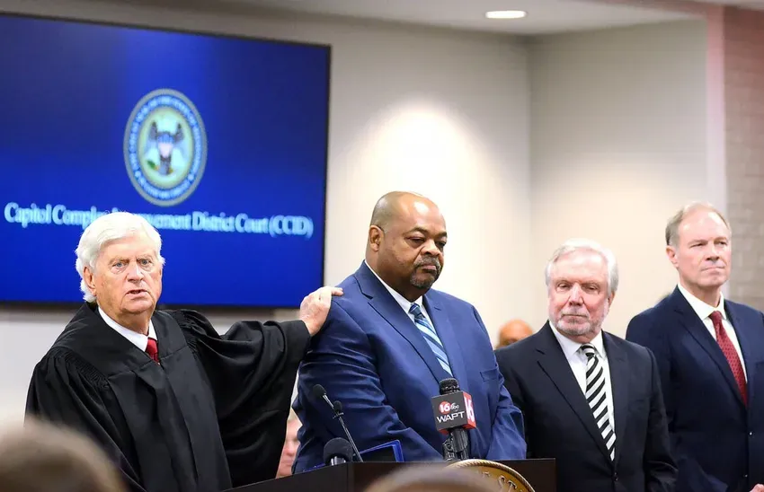 Supreme Court Chief Justice Mike Randolph (left) with his judicial appointees, Stanley Alexander (second left), James Holland (center) and Christopher Collins, during the opening of the Capitol Complex Improvement District Court on Friday, Jan. 24, 2025, in Jackson. Credit: Vickie D. King/Mississippi Today