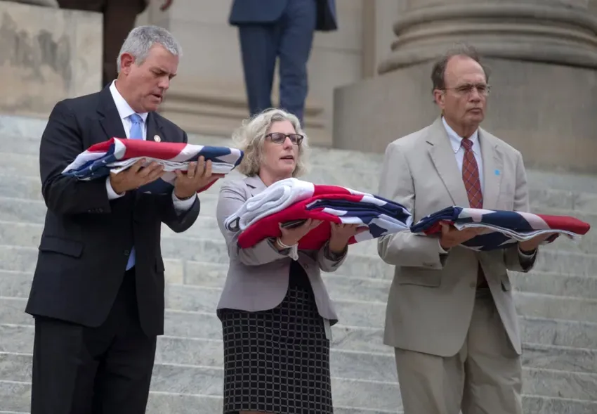 House Speaker Philip Gunn, from left, Mississippi Department of Archives and History Director Katie Blount, and Lt. Gov. Delbert Hosemann prepare to deliver the former state flag to the Mississippi Civil Rights Museum Wednesday, July 1, 2020. Credit: Eric J. Shelton/Mississippi Today