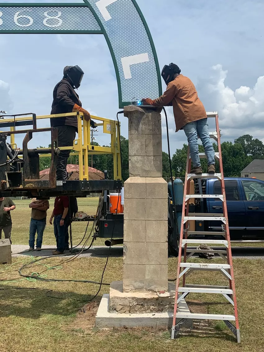 Once they completed the sign, the students and teachers from the college transported the new archway and attached them to the historic pillars, creating a beautiful welcome sign for the Town of Stonewall.