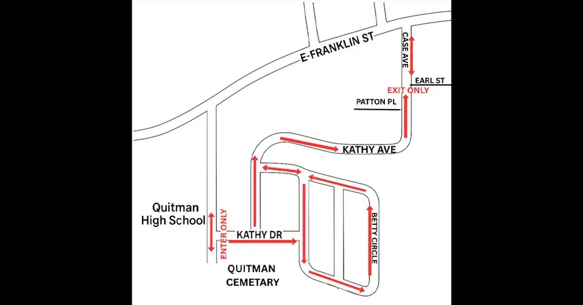 • Quitman will have trick or treating Friday, October 31, from 5:00 p.m. to 8:00 p.m. There will be a modified traffic route around Betty Circle during that time to make it safer for the kids going door to door. See map below.