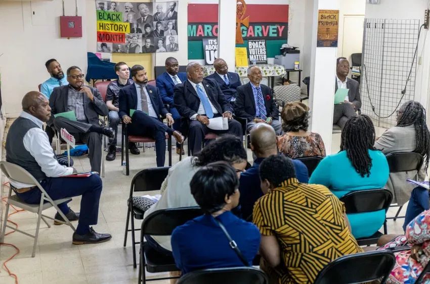 Mayoral candidates listen during a political forum at the Afrikan Art Gallery in Jackson, Miss., on Monday, March 17, 2025. Credit: Eric Shelton/Mississippi Today