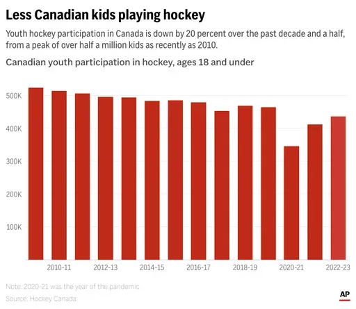 The United States has experienced steady growth in the sport over the past decade while Canada grapples with youth numbers declining significantly over the same period of time. Efforts by USA Hockey, National Hockey League teams and others to bring in more diverse families — and a boom especially in girls participation — have fueled the increase and opened the door for the U.S. to one day overtake its neighbor to the north as the game's preeminent power.