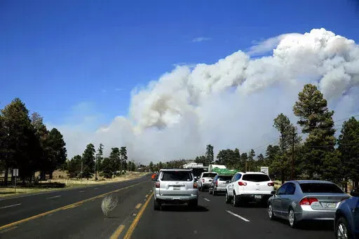 About 200 residents attended the community meeting Wednesday in Flagstaff at a middle school that's also being used as a shelter. Some lost their homes — part of the estimated 25 structures that have been lost — and were worried about finding temporary housing in a city where rental prices have exploded in recent years. One woman who was evacuated from the forest where she was camping wondered when she might be able to retrieve her things.